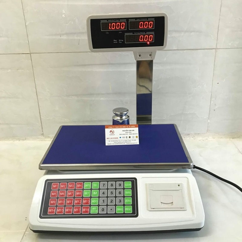 - Phím chức năng: có 40 phím chức năng. Từ 0 đến 9 dùng để nhập giá tiền, từ M1-M18 nhớ tên và giá sản phẩm, các phím chức năng cơ bản: on/off để bật nguồn, tare để trừ bì, tell: số điện thoai, clr để xóa, mode để chuyển đổi đơn vị......
